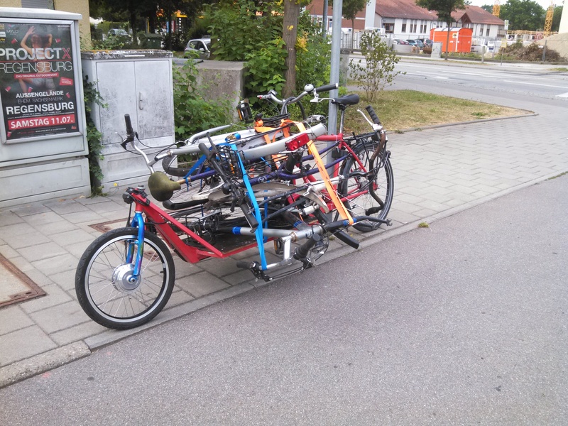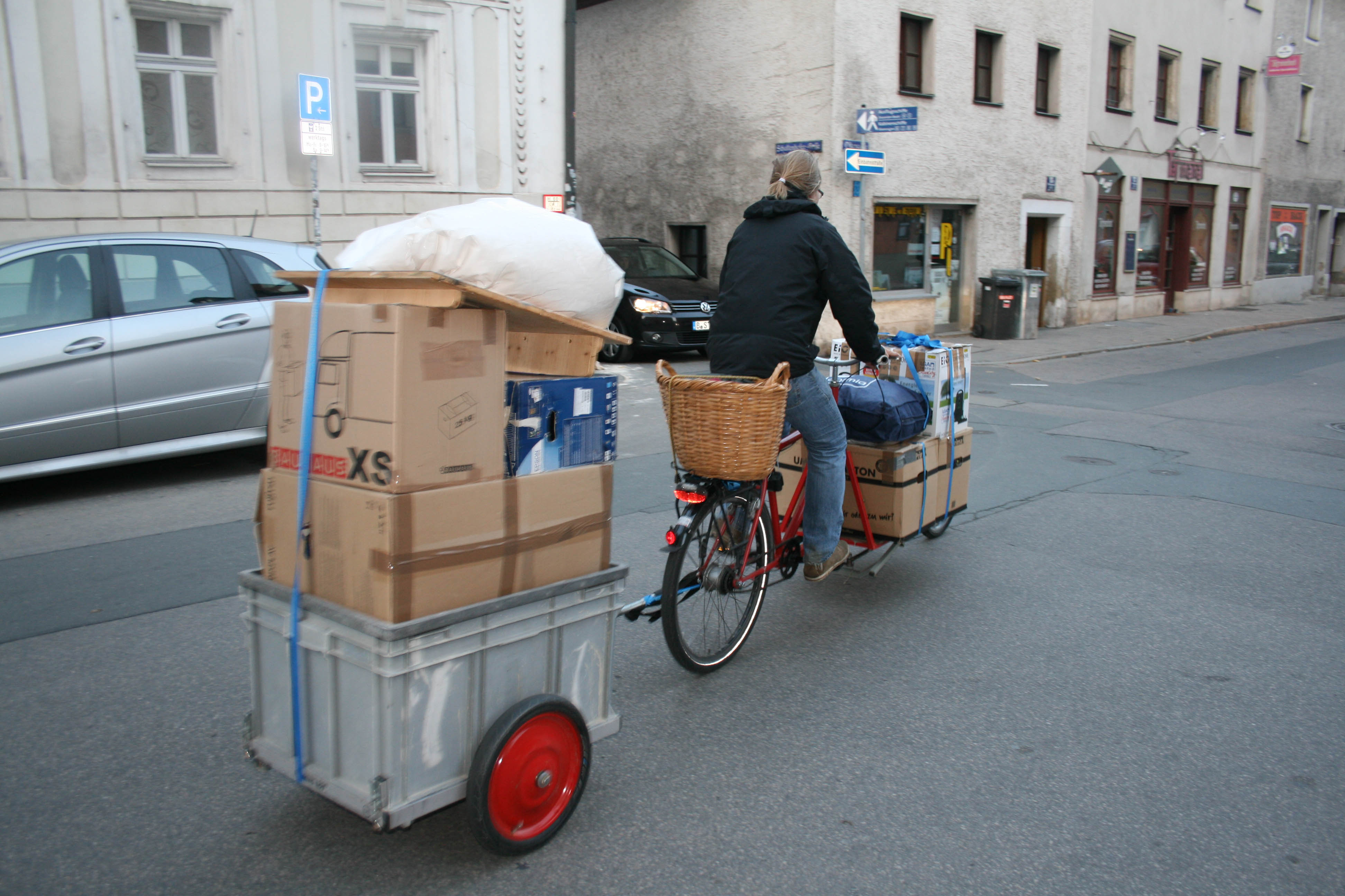 Es ging total gut. Das Gleichgewicht zu halten war kein Problem, ein bisschen Sorgen hat mir der Anhänger mit seinem Schwerpunkt gemacht, nicht dass er umfällt wenn man ihn zu hoch belädt. Man braucht jetzt für Umzüge kein Auto mehr. Man kann sich noch überlegen einen größeren Hänger zu bauen und damit kann man dann auch Möbel mit umziehen!